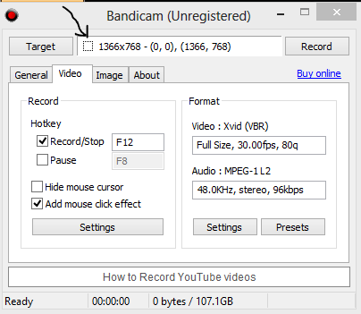After downloading launch the software a pop up box will then appear now on that pop up box at the top you will see a panel called target click on it wen it opens click RECTANGLE ON SCREEN now u will see this